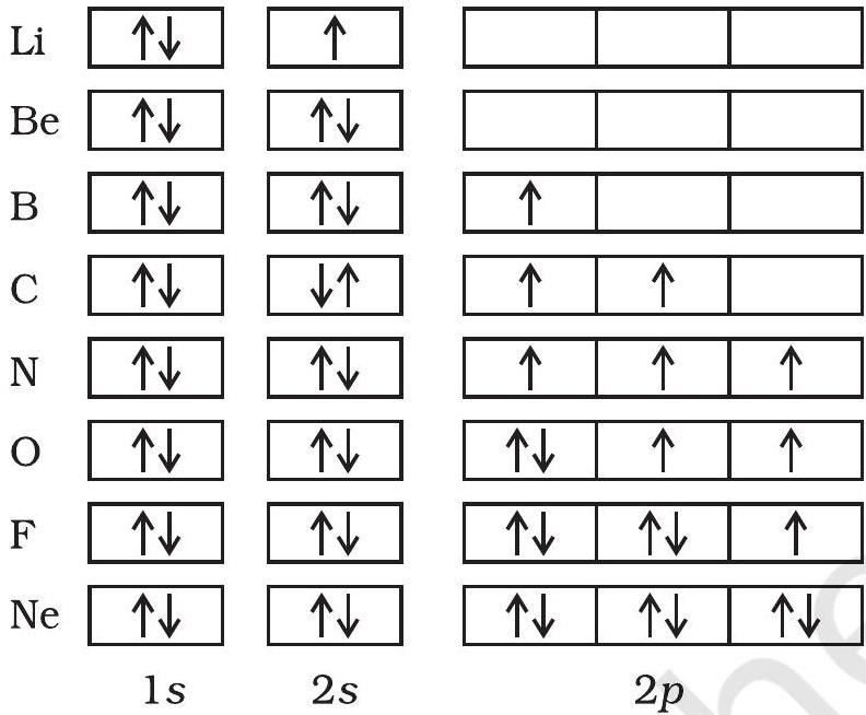 अगले छह तत्वों में—बोरॉन $\left(\mathrm{B}, 1 s^{2} 2 s^{2} 2 p^{1}\right)$, कार्बन (C, $\left.1 s^{2} 2 s^{2} 2 p^{2}\right)$, नाइट्रोजन $\left(\mathrm{N}, 1 s^{2} 2 s^{2} 2 p^{3}\right)$, ऑक्सीजन $\left(\mathrm{O}, 1 s^{2} 2 s^{2} 2 p^{4}\right)$, फ्लुओरीन $\left(\mathrm{F}, 1 s^{2} 2 s^{2} 2 p^{5}\right.$ ) और नियॉन (Ne, $\left.1 s^{2} 2 s^{2} 2 p^{6}\right)$—$2 p$ कक्षक क्रमिक रूप से भरे जाते हैं। यह प्रक्रिया नियॉन परमाणु के साथ पूरी होती है। इन तत्वों की कक्षक चित्र निम्नानुसार दर्शाए जा सकते हैं :