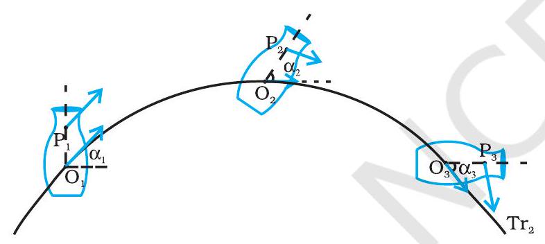चित्र 6.6 (a) और 6.6 (b) एक ही वस्तु की भिन्न गतियों को दर्शाते हैं। ध्यान दें कि $P$ वस्तु का एक स्वेच्छ बिंदु है; $O$ वस्तु का द्रव्यमान केंद्र है, जिसे अगले खंड में परिभाषित किया गया है। यहाँ इतना ही काफी है कि $O$ की प्रक्षेपपथ वस्तु की स्थानांतर प्रक्षेपपथ $\mathrm{Tr_1}$ और $\mathrm{Tr_2}$ हैं। समय के तीन भिन्न क्षणों पर $O$ और $\mathrm{P}$ की स्थितियाँ क्रमशः चित्र 6.6 (a) और (b) दोनों में $O_{1}, O_{2}$, और $O_{3}$, तथा $P_{1}, P_{2}$ और $P_{3}$ द्वारा दिखाई गई हैं। चित्र 6.6(a) से यह स्पष्ट है कि किसी भी क्षण वस्तु के किसी भी कण जैसे $O$ और $P$ के वेग शुद्ध स्थानांतर में समान होते हैं। ध्यान दें, इस स्थिति में $O P$ की अभिविन्यास, अर्थात् $O P$ द्वारा किसी निश्चित दिशा, मान लीजिए क्षैतिज, से बनाया गया कोण, समान रहता है, अर्थात् $\alpha_{1}=\alpha_{2}=\alpha_{3}$। चित्र 6.6 (b) स्थानांतर और घूर्णन के संयोजन की एक स्थिति को दर्शाता है। इस स्थिति में, किसी भी क्षण $O$ और $P$ के वेग भिन्न होते हैं। साथ ही, $\alpha_{1}, \alpha_{2}$ और $\alpha_{3}$ सभी भिन्न हो सकते हैं। इस प्रकार, जब तक अन्यथा न कहा जाए, हमारे लिए घूर्णन केवल एक निश्चित अक्ष के परितः ही होगा।