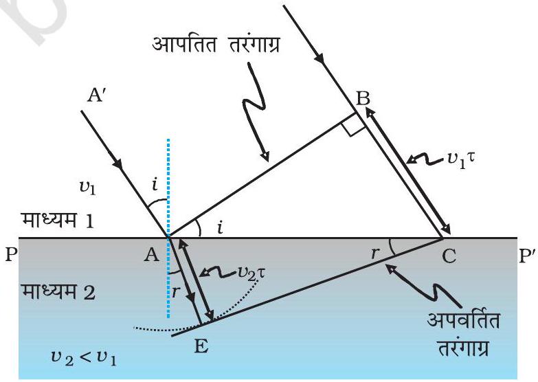 चित्र 10.4 एक समतल तरंग AB माध्यम 1 और माध्यम 2 को अलग करने वाली सतह PP′ पर कोण i पर आपतित होती है। समतल तरंग अपवर्तन से गुजरती है और CE अपवर्तित तरंगफ्रंट को दर्शाता है। यह चित्र v₂ < v₁ के अनुरूप है ताकि अपवर्तित तरंग सामान्य की ओर मुड़ती है।