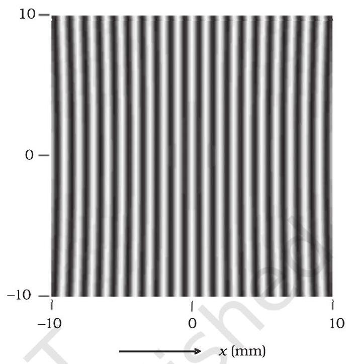 चित्र 10.13 कंप्यूटर द्वारा उत्पन्न फ्रिंज पैटर्न जो दो बिंदु स्रोतों (S_1) और (S_2) द्वारा स्क्रीन GG’ पर उत्पन्न होता है (चित्र 10.12); यह (d = 0.025) मिमी, (D = 5) सेमी और (\lambda = 5 \times 10^{-5}) सेमी के अनुरूप है। (स्रोत: OPTICS by A. Ghatak, Tata McGraw Hill Publishing Co. Ltd., नई दिल्ली, 2000.)