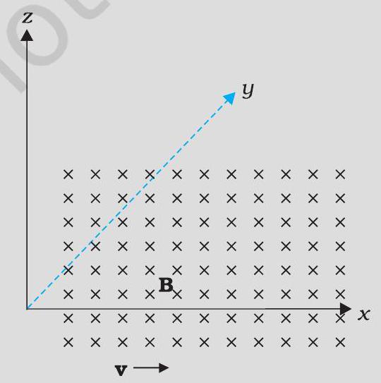 हल कण का वेग $\mathbf{v}$ $x$-अक्ष के अनुदिश है, जबकि $\mathbf{B}$, चुंबकीय क्षेत्र $y$-अक्ष के अनुदिश है, इसलिए $\mathbf{v} \times \mathbf{B}$ $z$-अक्ष के अनुदिश है (स्क्रू नियम या दाएँ हाथ का अंगूठा नियम)। तो, (a) इलेक्ट्रॉन के लिए यह $-Z$ अक्ष के अनुदिश होगा। (b) धनात्मक आवेश (प्रोटॉन) के लिए बल $+z$ अक्ष के अनुदिश होगा।