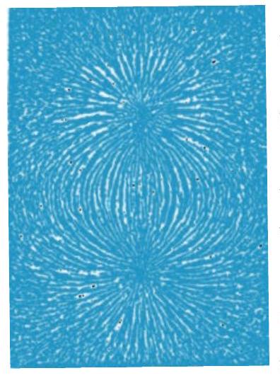 चित्र 5.1 एक छड़ चुंबक के चारों ओर लोहे के बुरादे की व्यवस्था। यह पैटर्न चुंबकीय क्षेत्र रेखाओं की नकल करता है। यह पैटर्न सुझाव देता है कि छड़ चुंबक एक चुंबकीय द्विध्रुव है।