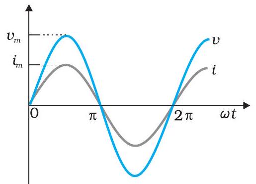 समीकरण (7.3) ओम का नियम है, जो प्रतिरोधकों के लिए, ac और dc दोनों वोल्टेज के लिए समान रूप से कार्य करता है। एक शुद्ध प्रतिरोधक के सिरों पर वोल्टेज और उससे प्रवाहित धारा, जो समीकरण (7.1) और (7.2) द्वारा दी गई है, को चित्र 7.2 में समय के फलन के रूप में आलेखित किया गया है। विशेष रूप से ध्यान दें कि दोनों $v$ और $i$ एक ही समय पर शून्य, न्यूनतम और अधिकतम मान तक पहुँचते हैं। स्पष्ट है कि वोल्टेज और धारा एक दूसरे के साथ समान कला में हैं।