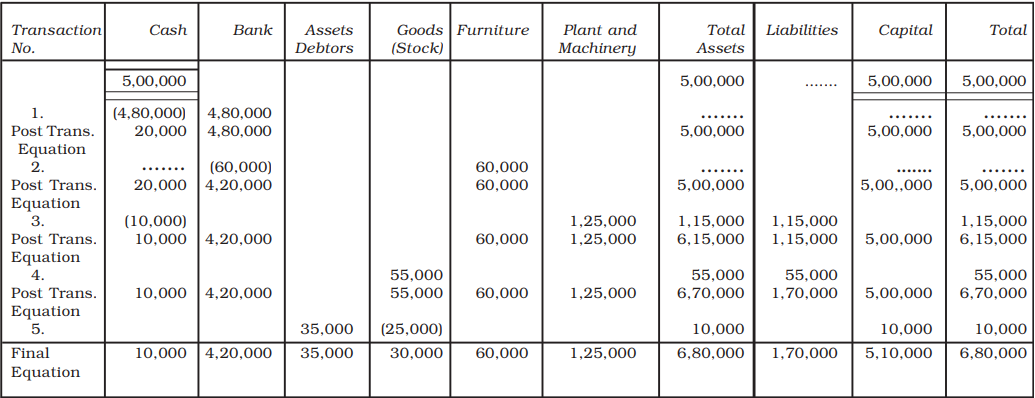 Analysis of transaction: This transaction decreases stock of goods (assets) by ₹ 25,000 and increases assets (Rajani Enterprises as debtors ₹ 35,000) and capital (with the profit of ₹ 10,000) The final equation as per the above analysis table can be summarised in the form of a balance sheet as under: