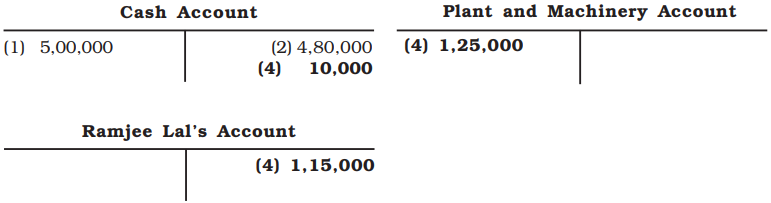 4. Bought Plant and Machinery from Ramjee lal for the business for - ₹ 1,25,000 and an advance of ₹ 10,000 in cash is given.