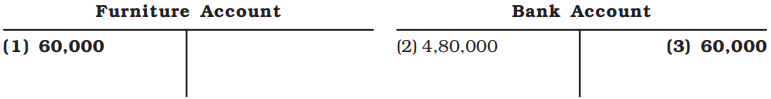 Analysis of Transaction: This transaction increases furniture (assets) on one hand and decreases bank (assets) on the other hand by ₹ 60,000 . Increases in assets are debited and decreases are credited. Therefore record the transactions with debit to Furniture account and credit to Bank account.