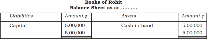 For example, Rohit started business with a capital of ₹ 5,00,000. From the accounting point of view, the resources of this business entity is in the form of cash, i.e., ₹ 5,00,000. Sources of this business entity is the contribution by Rohit (Proprietor) ₹ 5,00,000 as Capital.