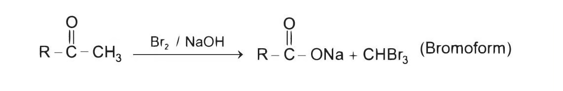 Acetaldehyde and methylalkyl ketones react rapidly with halogen $(Cl_2, Br_2$ or $I_2$ ) in the presence of alkali to give haloform and acid salt.
