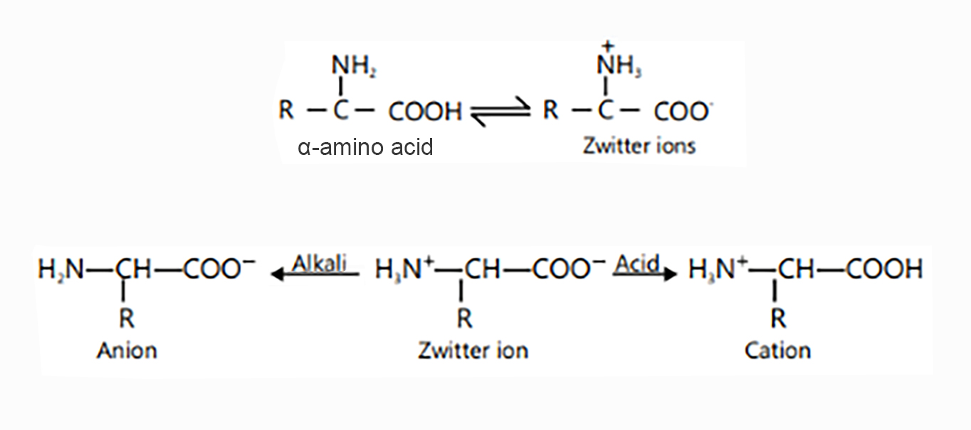 However, the neutral zwitter ion (dipolar ions) changes to cation in acidic solution and exist as anion in alkaline medium. Thus amino acids exhibit amphoteric character.