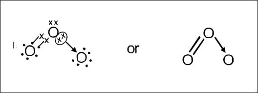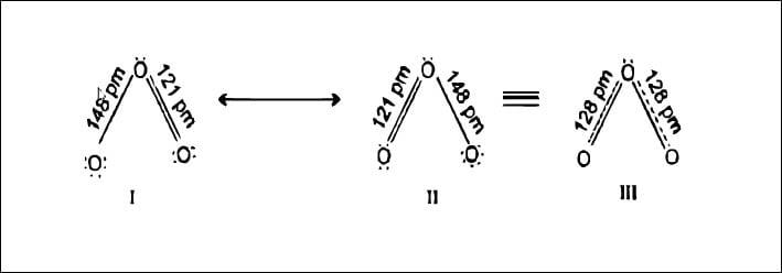 For example, the ozone, $\mathrm{O}_{3}$ molecule can be equally represented by the structures I and II shown below .