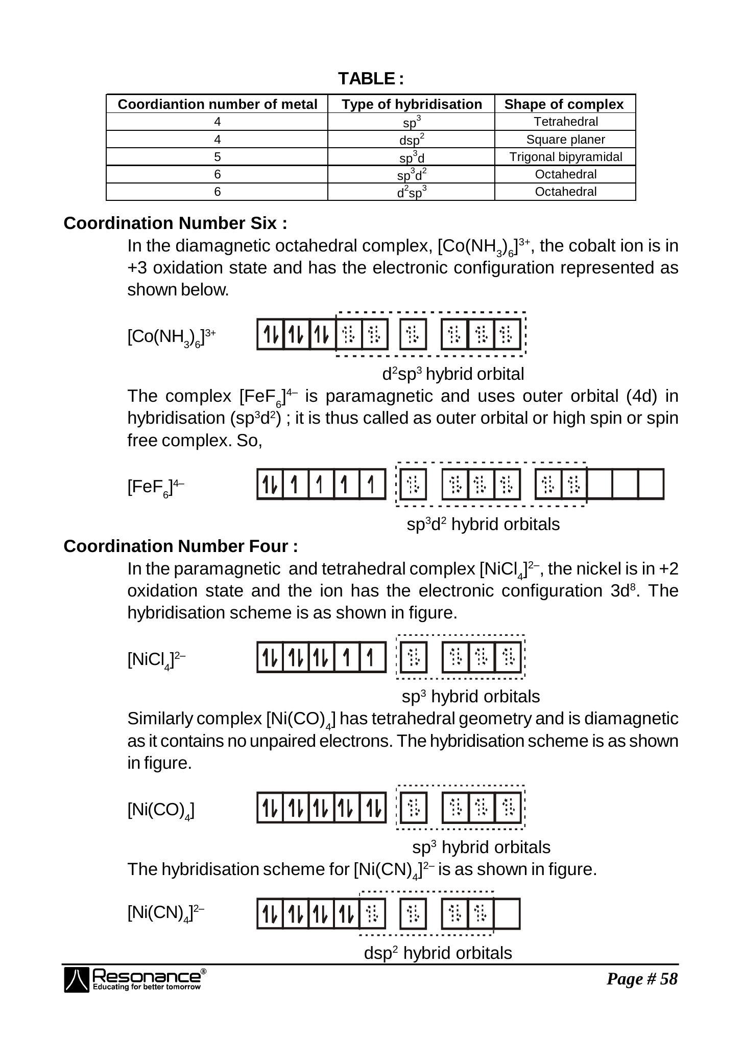 For metal ions with upto three electrons in the d-orbitals like $\mathrm{Ti}^{3+},\left(\mathrm{d}^{1}\right) ; \mathrm{V}^{3+}$ $\left(d^{2}\right) ; \mathrm{Cr}^{3+}\left(d^{3}\right)$; two vacant $d$-orbitals are easily available for octahedral hybridisation. The magnetic behaviour of these free ions and their coordination entities is similar. When more than three 3d electrons are present, like in $\mathrm{Cr}^{2+}$ and $\mathrm{Mn}^{3+}\left(\mathrm{d}^{4}\right) ; \mathrm{Mn}^{2+}$ and $\mathrm{Fe}^{3+}\left(\mathrm{d}^{5}\right) ; \mathrm{Fe}^{2+}$ and $\mathrm{Co}^{3+}\left(\mathrm{d}^{6}\right)$; the required two vacant orbitals for hybridisation is not directly available (as a consequence of Hund’s rules).