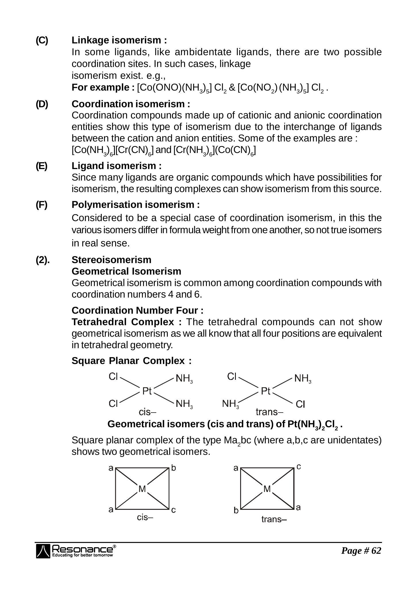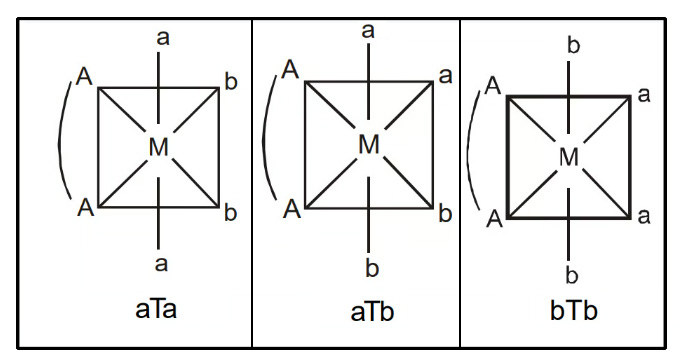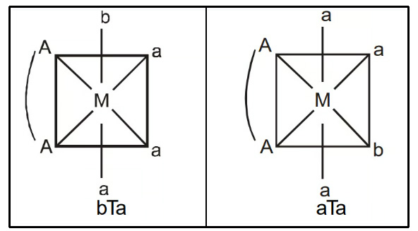 - Square planar complex of the type $\mathrm{Ma}_{2} \mathrm{bc}$ (where $\mathrm{a}, \mathrm{b}, \mathrm{c}$ are unidentates) shows two geometrical isomers.