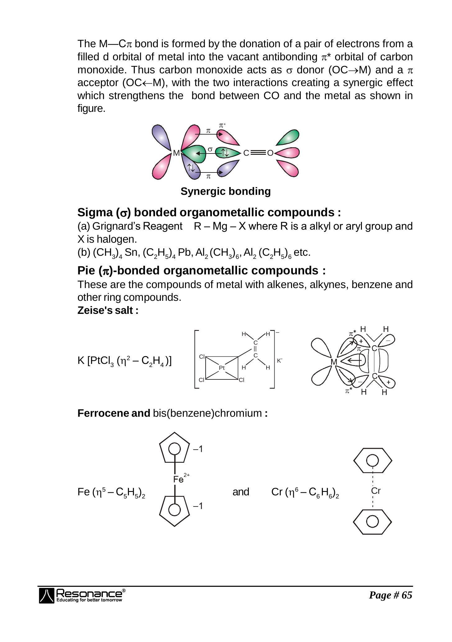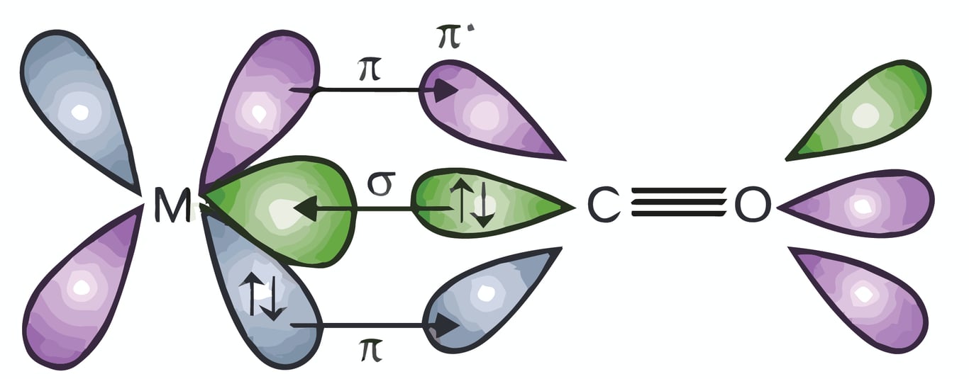 The $\mathrm{M}-\mathrm{C} \pi$ bond is formed by the donation of a pair of electrons from a filled $d$ orbital of metal into the vacant antibonding $\pi^{\star}$ orbital of carbon monoxide. Thus carbon monoxide acts as $\sigma$ donor $(\mathrm{OC} \rightarrow \mathrm{M})$ and a $\pi$ acceptor $(O C \leftarrow M)$, with the two interactions creating a synergic effect which strengthens the bond between $\mathrm{CO}$ and the metal as shown in figure.