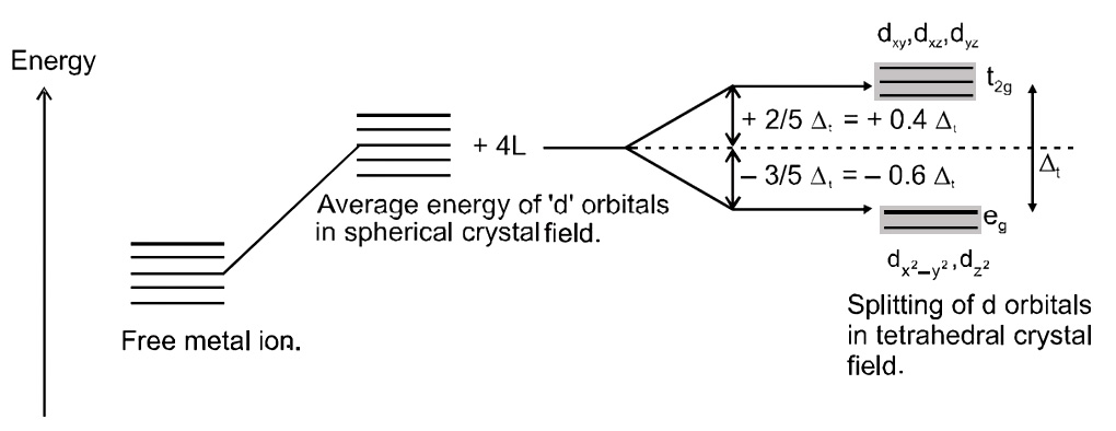In tetrahedral coordination entity formation, the d orbital splitting is inverted and is smaller as compared to the octahedral field splitting. For the same metal, the same ligands and metal-ligand distances, it can be shown that $\Delta_{\mathrm{t}}=(4 / 9) \Delta_{o}$.
