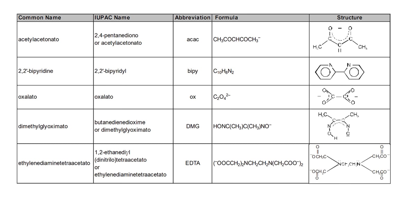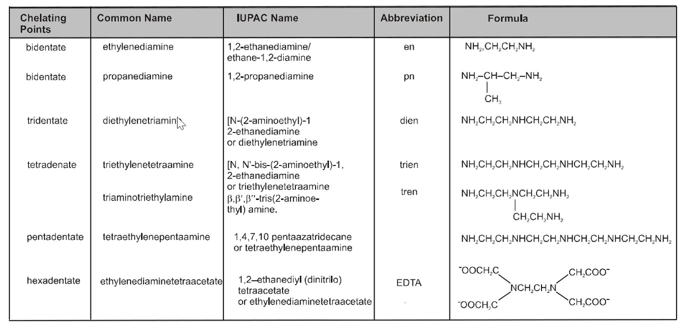 (iii) Polydentate ligands are also placed alphabetically. In case of abbreviated ligand, the first letter of the abbreviation is used to determine the position of the ligand in the alphabetical order.