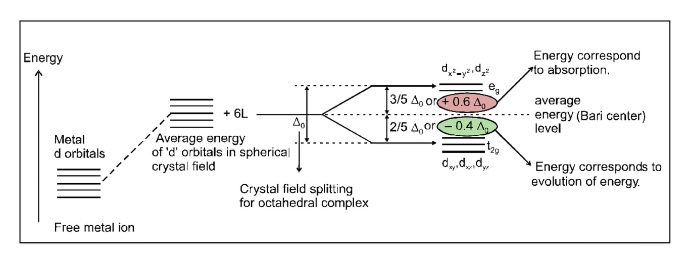 According to the crystal field theory the colour is due to the d-d transition of electron under the influence of ligands. We know that the colour of a substance is due to the absorption of light at a specific wavelength in the visible part of the electromagnetic spectrum (400 to $700 \mathrm{~nm}$ ) and transmission or reflection of the rest of the wavelengths.