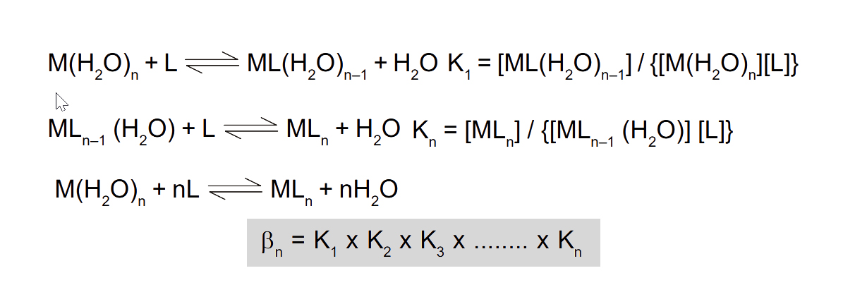 for the overall reaction : $M\left(H_2 O\right)_n+n L \rightleftharpoons ML_n+nH_2 O$