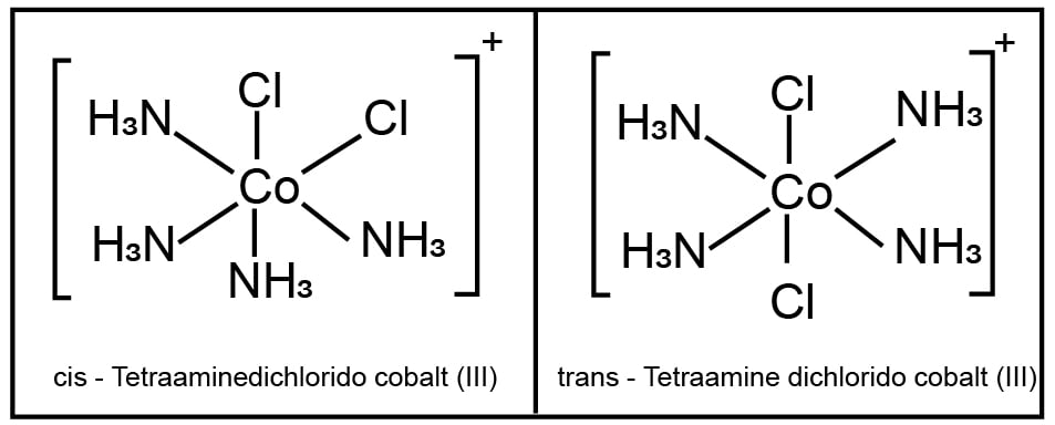 Geometrical isomers (cis and trans) of $[Co(NH_3)_4Cl_2]^+$ are as follows: