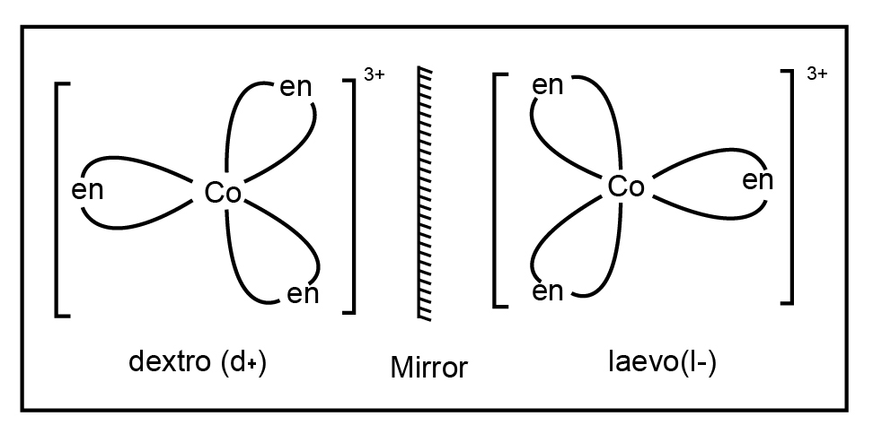 Optical isomerism is common in octahedral complexes involving didentate ligands. For example, $\left[\mathrm{Co}(\mathrm{en})_{3}\right]^{3+}$ has $\mathrm{d}$ and $\ell$ forms as given below.
