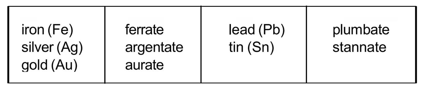 (vi) If the complex ion is a cation, the metal is named same as the element. For example, $\mathrm{Co}$ in a cationic complex is called cobalt and $\mathrm{Pt}$ is called platinum. If the complex ion is an anion, the name of the metal ends with the suffix - ate. For example, Co in an anionic complex, $[Co(SCN)_4]^{2-}$ is called cobaltate. For some metals, the Latin names are used in the complex anions.