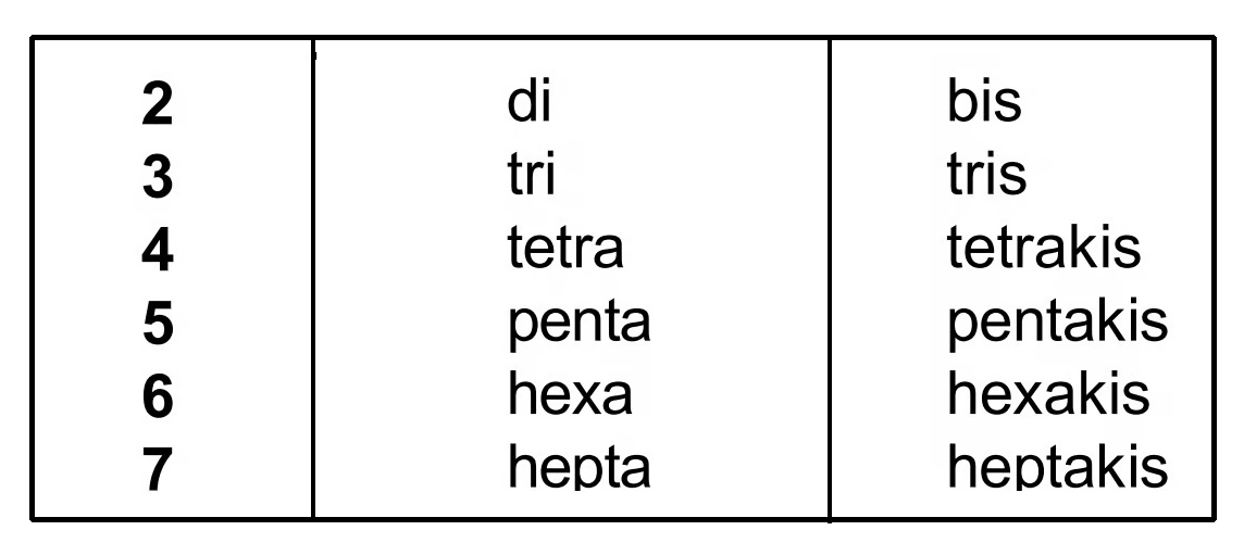 (iv) Prefixes mono, di, tri, etc., are used to indicate the number of the one kind of ligands in the coordination entity. When the names of the ligands include a numerical prefix or are complicated or whenever the use of normal prefixes creates some confusion, it is set off in parentheses and the second set of prefixes is used.