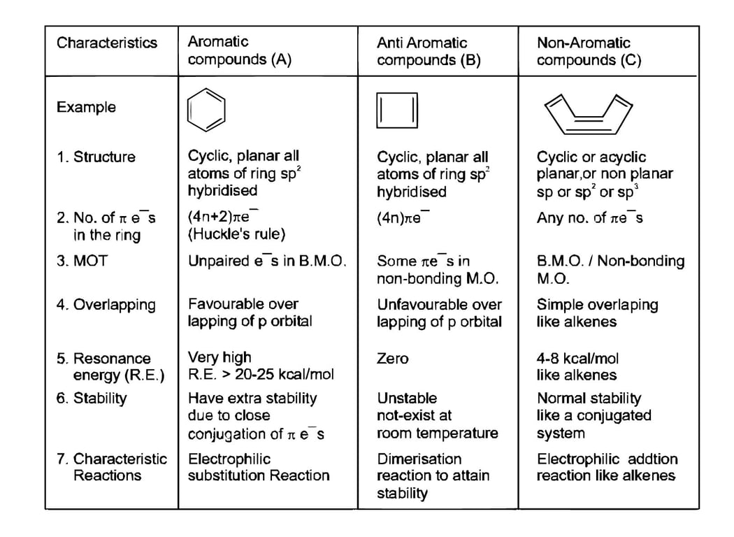 Comparison between aromatic, anti aromatic and non-aromatic compounds.