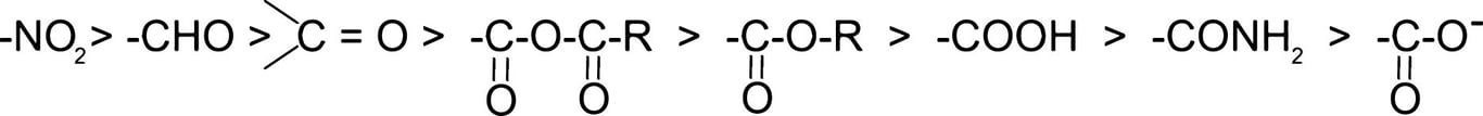 $-NR_3 > -SR_2 > -NH_3 > -NO_2 > -SO_{2}R > -CN > -CHO > -COOH > -F > -Cl > -Br > -I > -OR > -OH > -C = CH > -NH_2 > - C_6H_5 > -CH = CH_2 > -H$