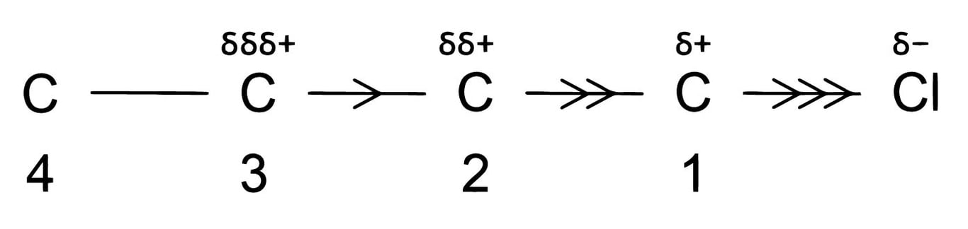 Consider a carbon chain in 1-Chloro butane, here due to more $\mathrm{EN}$ of $\mathrm{Cl}$ atom $\mathrm{C}-\mathrm{Cl}$ bond pair is slightly displaced towards Cl atom hence creating partial negative $(\delta^{-})$ charge over Cl atom and partial positive $\left(\delta^{+}\right)$ charge over $\mathrm{C}_{1}$ atom.