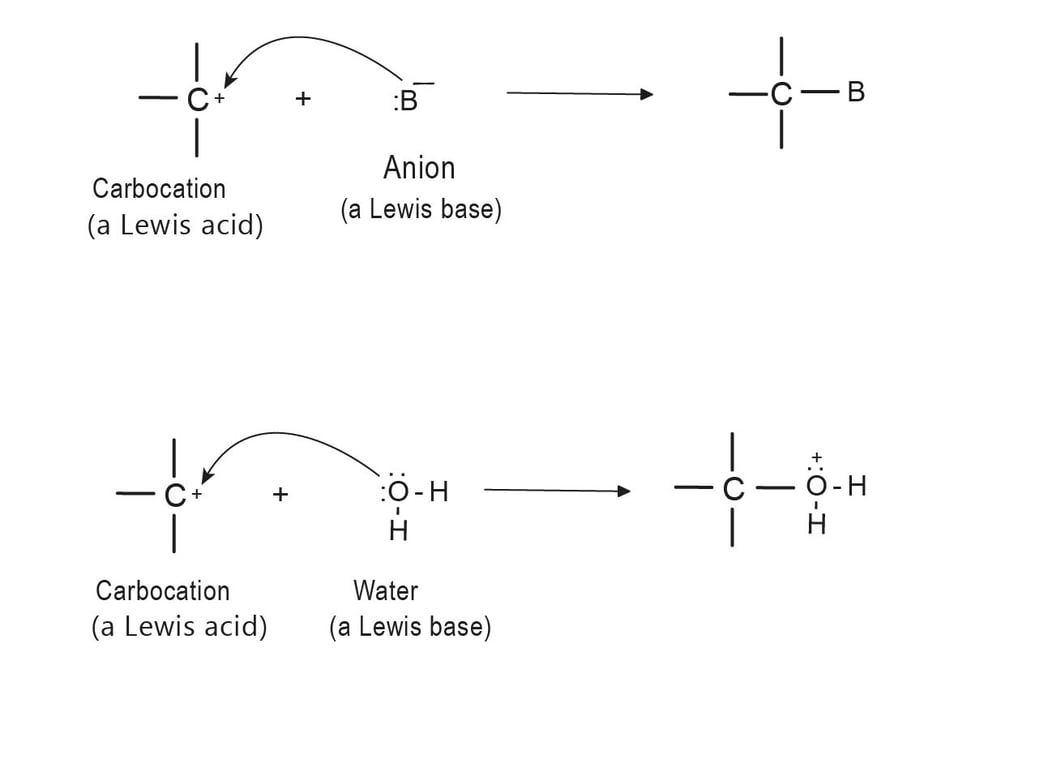 Carbocations are electron deficient. They have only six electrons in their valence shell, and because of this, carbocations act as Lewis acids. Most of the carbocations are short-lived and highly reactive, they occur as intermediates in some organic reactions. Carbocations react with Lewis bases or ions that can donate the electron pair, that they need to achieve a stable octet of electrons (i.e., the electronic configuration of a noble gas):