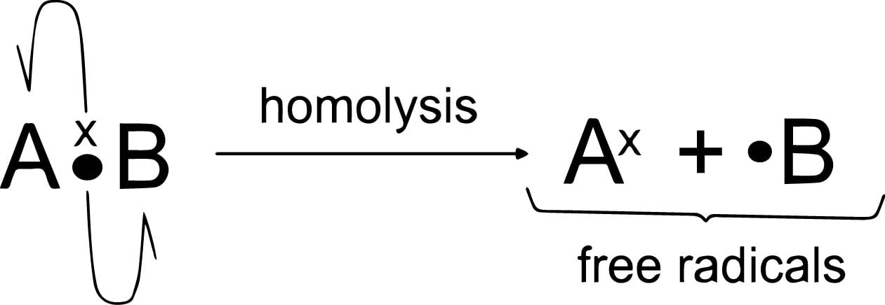 Homolytic fission is the symmetrical breakdown of a covalent connection in which each leaving atom removes one electron from the bonded pair.