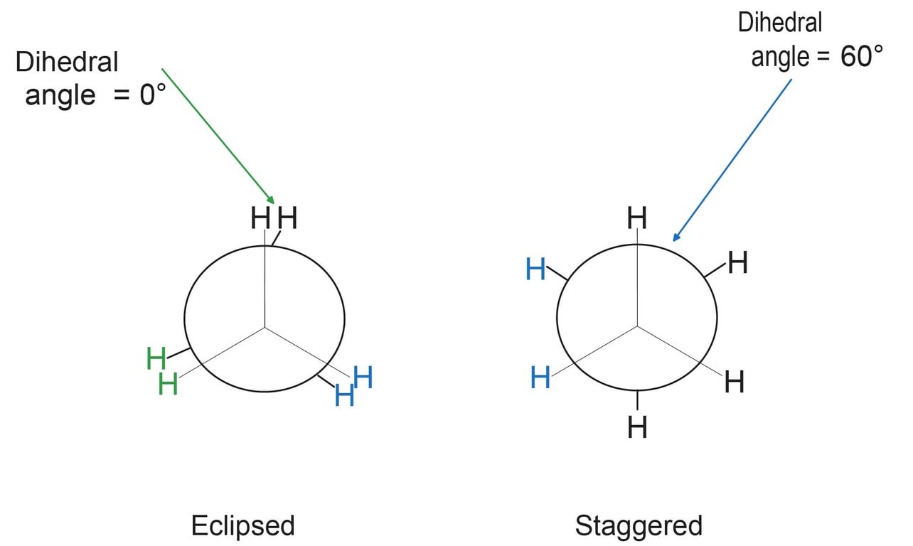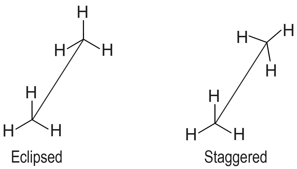 The repulsive interaction between the electron clouds, which affects stability of a conformation, is called torsional strain. Magnitude of torsional strain depends upon the angle of rotation about CāC bond. This angle is also called dihedral angle or torsional angle. Of all the conformations of ethane, the staggered form has the least torsional strain and the eclipsed form, the maximum torsional strain. Therefore, staggered conformation is more stable than the eclipsed conformation.