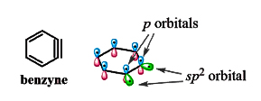 It is also important to note that hybridization of each carbon involved in ‘Benzyne bond’ is $\mathrm{sp}^{2}$ since the overlap between these $\mathrm{sp}^{2}$ hybrid orbitals is not so much effective.