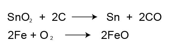 $\mathrm{SnO}_{2}$ is reduced to metal using carbon at $1200-1300^{\circ} \mathrm{C}$ in an electric furnace. The product often contains traces of $\mathrm{Fe}$, which is removed by blowing air through the molten mixture to oxidize $\mathrm{FeO}$ which then floats to the surface.
