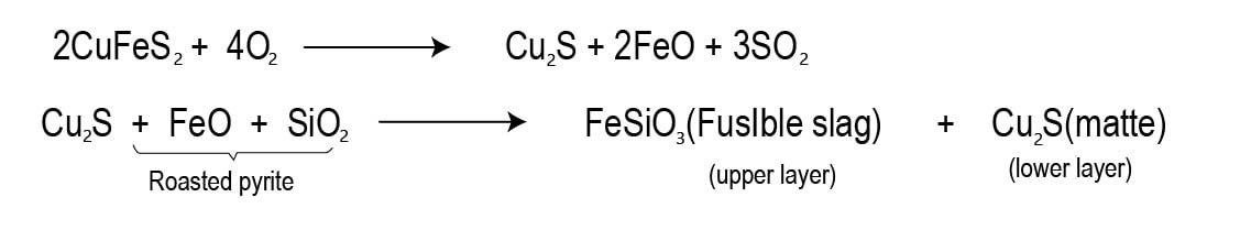 $Cu_2S + FeO + SiO_2 \longrightarrow FeSiO_3$ (fusible slag) $+Cu_2S$ (matte)