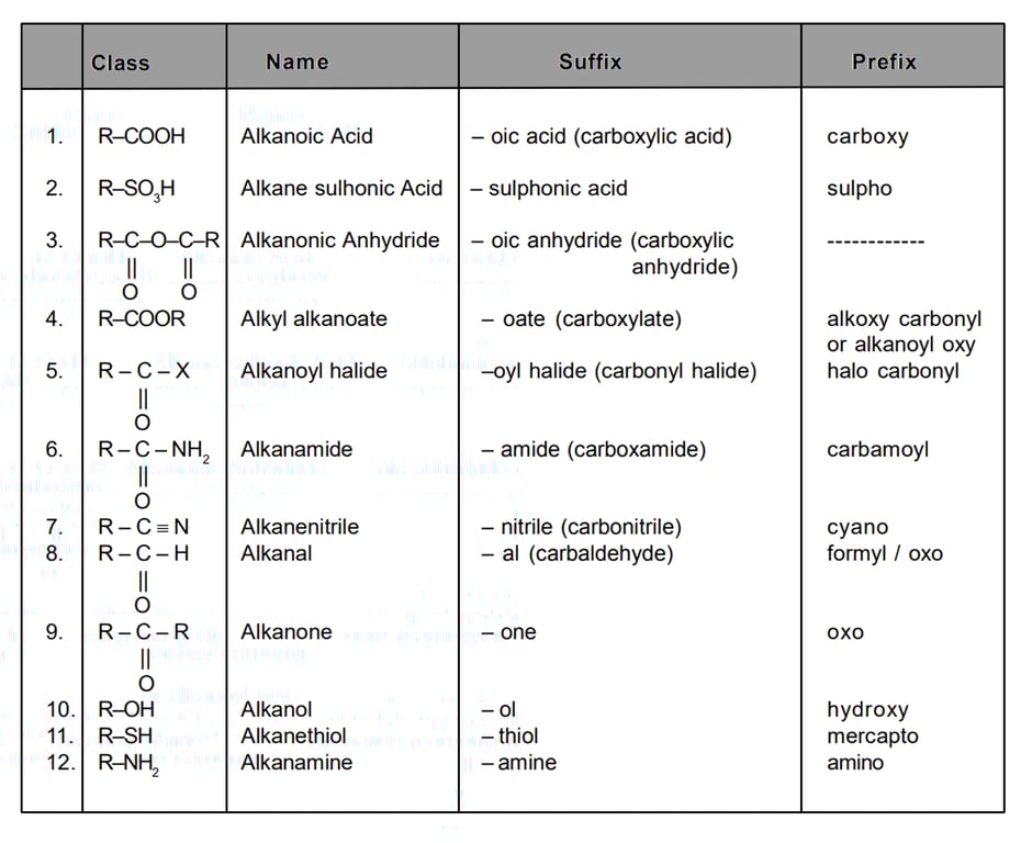 A secondary suffix is added to the primary suffix to indicate the nature of the functional group present in the organic compounds. Secondary suffix of important functional groups are given below in their decreasing order of seniority.