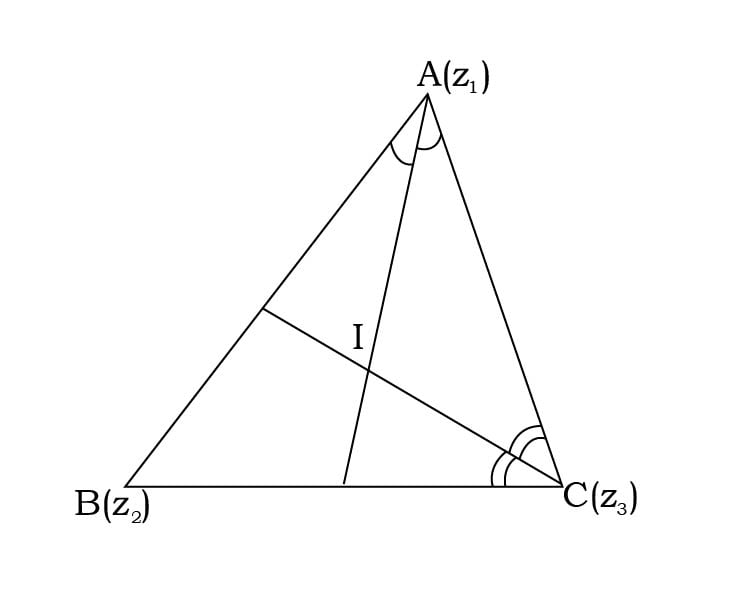 - Incentre: The incentre ’ $I$ ’ is given by $\frac{a z_{1}+b z_{2}+c z_{3}}{a+b+c}$. Refer to Fig for incentre .