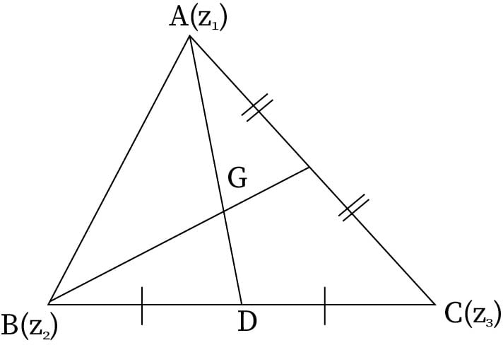 - Centroid: The centroid ’ $G$ ’ is given by $\frac{z_{1}+z_{2}+z_{3}}{3}$. Refer to Fig for centroid.