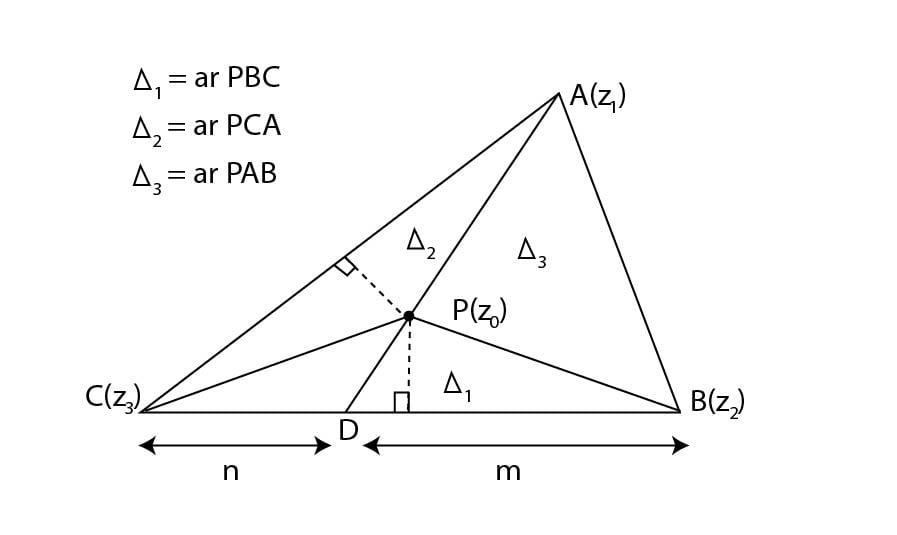 $\therefore \frac{\mathrm{m}}{\mathrm{n}}=\frac{\text { Ar. } \triangle \mathrm{ABD}-\mathrm{Ar} \cdot \triangle \mathrm{PBD}}{\text { Ar. } \triangle \mathrm{ADC}-\mathrm{Ar} \cdot \Delta \mathrm{PDC}}=\frac{\Delta_{3}}{\Delta_{2}}$