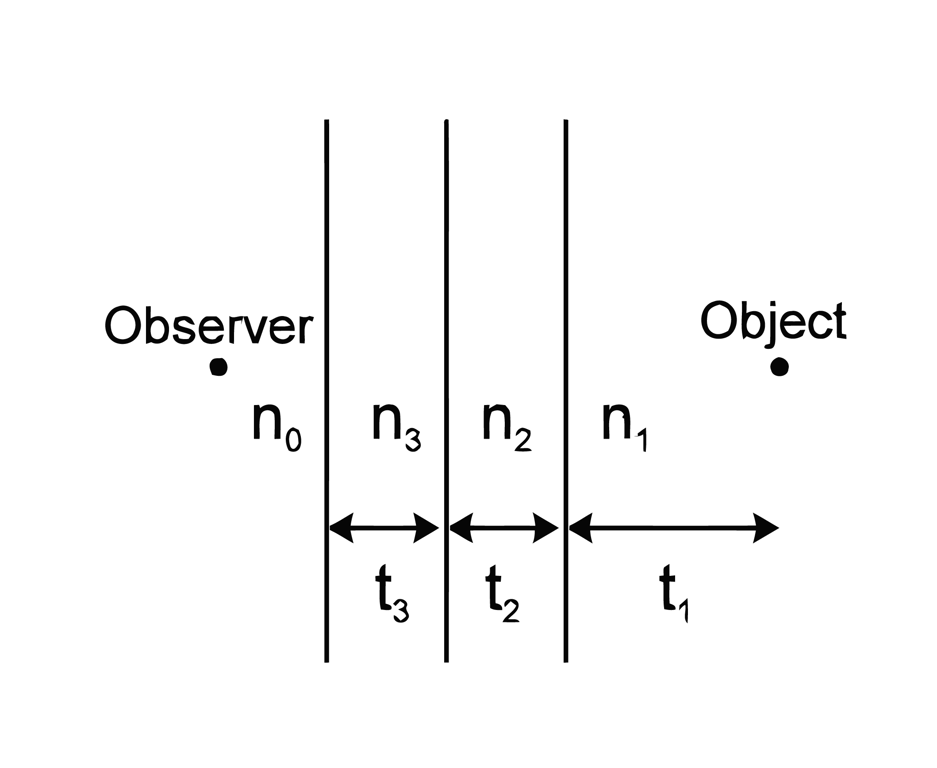 $\text{Apparent shift}=t_{1}\left[1-\frac{1}{n_{1 \text { rel }}}\right]+t_{2}\left[1-\frac{1}{n_{2 \text { rel }}}\right]+\ldots \ldots . .+\left[1-\frac{n}{n_{n \text { rel }}}\right]$