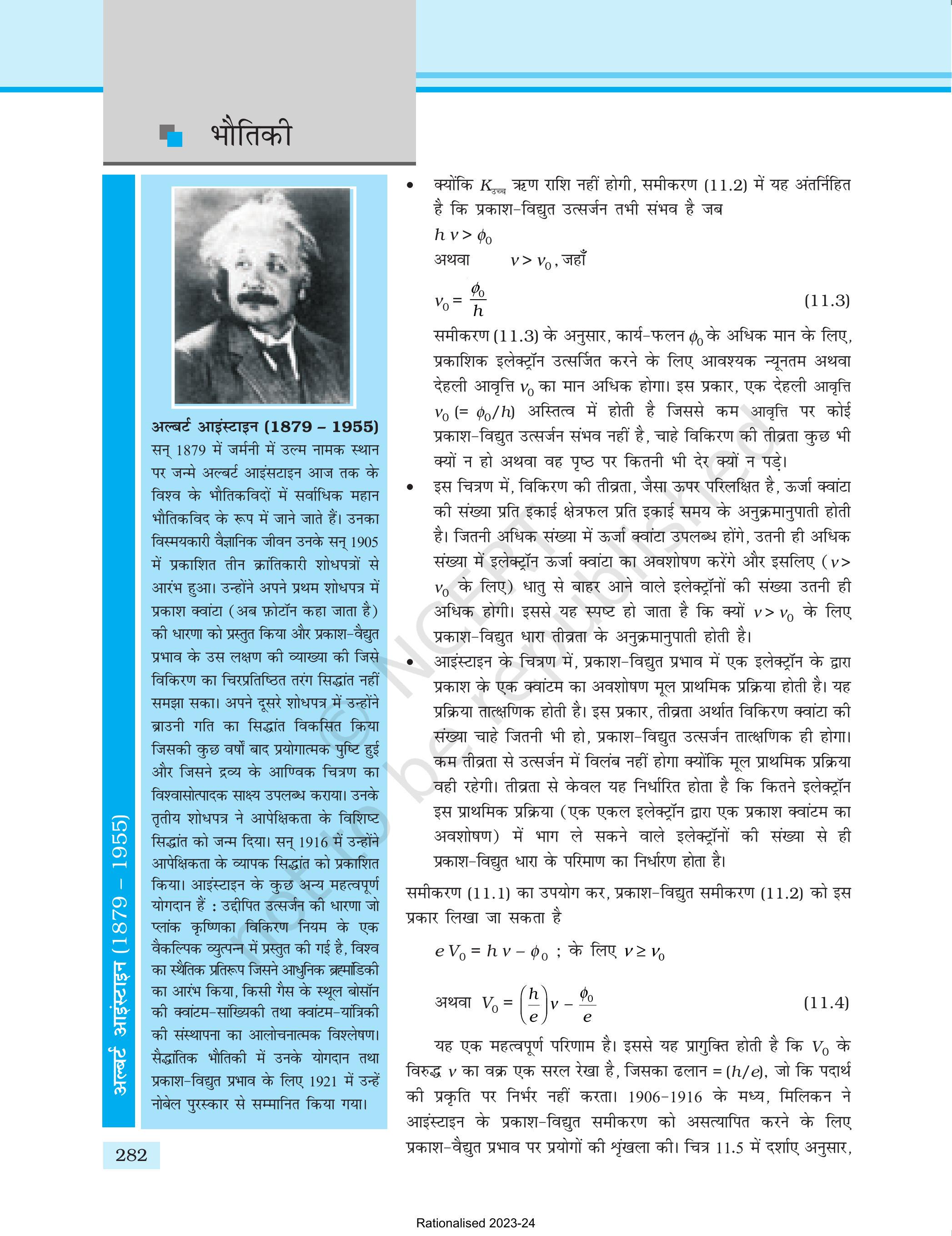 Equation (11.2) is known as Einstein’s photoelectric equation. We now see how this equation accounts in a simple and elegant manner all the observations on photoelectric effect given at the end of sub-section 11.4.3.