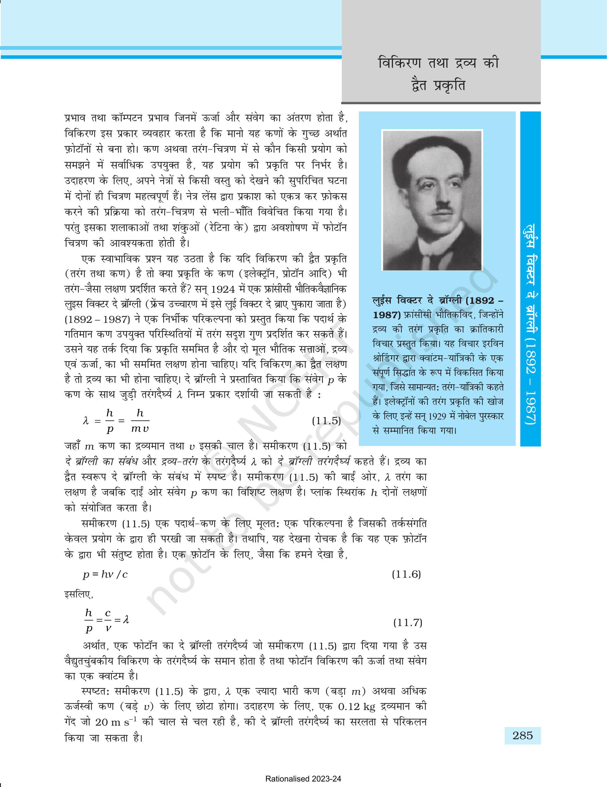 A natural question arises: If radiation has a dual (waveparticle) nature, might not the particles of nature (the electrons, protons, etc.) also exhibit wave-like character? In 1924, the French physicist Louis Victor de Broglie (pronounced as de Broy) (1892-1987) put forward the bold hypothesis that moving particles of matter should display wave-like properties under suitable conditions. He reasoned that nature was symmetrical and that the two basic physical entities - matter and energy, must have symmetrical character. If radiation shows dual aspects, so should matter. De Broglie proposed that the wave length $\lambda$ associated with a particle of momentum $p$ is given as