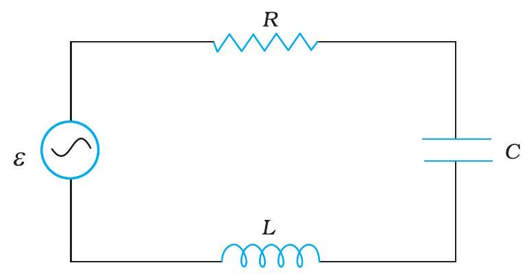 Figure 7.1 shows a resistor connected to a source $\varepsilon$ of ac voltage. The symbol for an ac source in a circuit diagram is $\Theta$. We consider a source which produces sinusoidally varying potential difference across its terminals. Let this potential difference, also called ac voltage, be given by