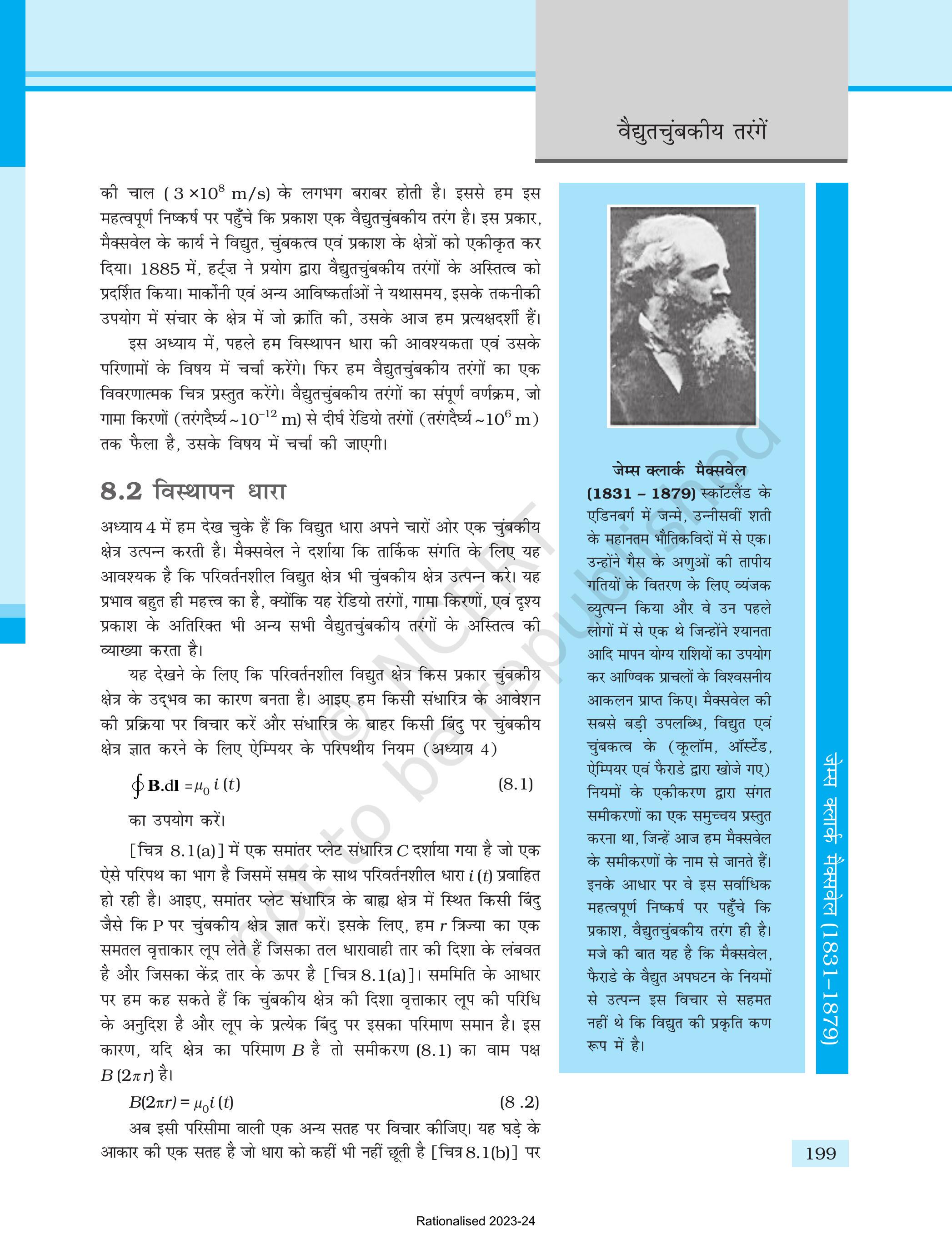 In Chapter 4, we learnt that an electric current produces magnetic field and that two current-carrying wires exert a magnetic force on each other. Further, in Chapter 6, we have seen that a magnetic field changing with time gives rise to an electric field. Is the converse also true? Does an electric field changing with time give rise to a magnetic field? James Clerk Maxwell (1831-1879), argued that this was indeed the case - not only an electric current but also a time-varying electric field generates magnetic field. While applying the Ampere’s circuital law to find magnetic field at a point outside a capacitor connected to a time-varying current, Maxwell noticed an inconsistency in the Ampere’s circuital law. He suggested the existence of an additional current, called by him, the displacement current to remove this inconsistency.